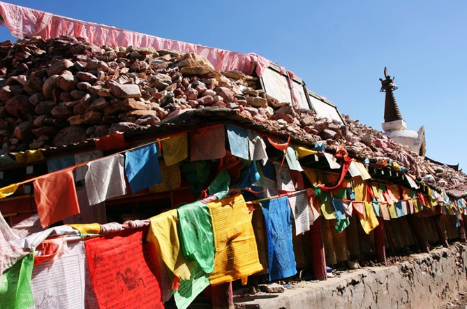 在青海省玉樹藏族自治州政府所在地結(jié)古鎮(zhèn),乘上3路公交車,大約20分鐘就到了新寨村,這里有世界上最大的瑪尼堆——新寨瑪尼城。新寨瑪尼城建于公元1715年,奠基人為第一世加納活佛宗求帕文,所以也稱為“加納瑪尼堆”?,斈岫言诓卣Z中稱“多崩”,意為“十萬經(jīng)石”的意思。占地有兩個足球場大小的新寨瑪尼城,版權(quán)所有山東聊城聊之旅國際旅行社有限公司,轉(zhuǎn)載必究!南部是新寨寺,其他各個方向均用瑪尼石堆砌成墻,在高高的圍墻高處還布滿了隨風(fēng)飄舞的經(jīng)幡。