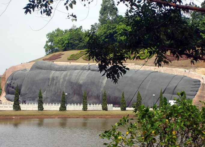 大臥佛位于森林公園天仙巖。相傳當(dāng)年佛教大師六祖惠能傳教后深夜經(jīng)過這里,看到天仙巖靈光閃爍,隱約可見這塊橫臥的大石塊就是一個(gè)大臥佛,六祖立即跪拜,求佛祖降福天下。大臥佛的雕造從這個(gè)傳說(shuō)獲取靈感,以盛唐敦煌臥佛為范本,佛身長(zhǎng)108米,尺度堪稱世界之最?,F(xiàn)經(jīng)改造用紫銅包裝大臥佛,成為金裝大臥佛。大佛前面是錦鯉池和荷花池,與大佛相互映襯引人入勝。大佛對(duì)岸一層為長(zhǎng)六十米的長(zhǎng)廊,廊內(nèi)彩繪佛傳故事,二層為敬佛臺(tái),憑欄對(duì)拜,大佛全景一覽無(wú)遺。