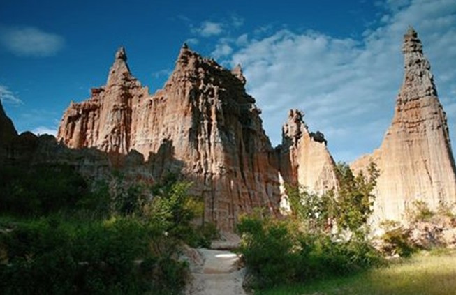 虎跳灘土林的景點分布在主溝和支溝兩側(cè)。主溝為東西向的干涸河床,寬10?40米,總長1500米,河床表面為黃色細砂和彩色礫石。支溝分布在主溝南北兩則,寬0.5-8米,總長4300米。土林佳景大多集中在支溝兩側(cè)。主溝的北側(cè)有元帥府,古堡幽情,駱駝峰3條支溝;南側(cè)有無名溝,歐亞奇觀2條支溝;另外還有幾條小支溝尚未命名。版權(quán)所有山東聊城聊之旅國際旅行社有限公司,轉(zhuǎn)載必究!歐亞奇觀是虎跳灘土林最佳景觀,這里土林高大挺拔,造型大都似古代宮廷殿堂,中西合璧,相映生輝。元帥府土林以動物造型為特色,如熊貓、獅、虎、鷹、雕等走獸飛禽,惟妙惟肖。古堡幽情以赤、褐、黑三色土帽蓋頂而取勝。