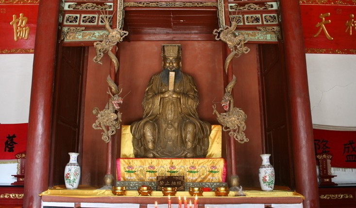 大成殿殿頂用黃、綠、藍(lán)、三色琉璃瓦覆蓋,門窗、木柱用朱漆彩畫,整座建筑雕梁畫棟,金碧輝煌。大成殿的門上方掛著歷代皇帝、名人題的“萬世師表”、“與天地參”、“圣集大成”、“斯民在茲”等九塊匾額,紅底金字,光彩奪目。在大成殿內(nèi)正中的1.6米高臺上供有鑄于清康熙四十七年(1708年)的孔子全身銅像。銅像頭戴冕冠,手捧朝笏,儀態(tài)威嚴(yán),正額端坐。其高約2.3米,重約2500公斤,論其重、其大、其鑄造工藝之精美、保存之完好在國內(nèi)均屬無雙尊者