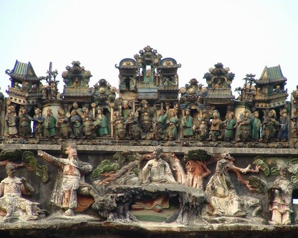 石灣陶塑脊飾。清代在南海、番禺、順德和香港、澳門(mén)等地的祠堂廟宇或富家豪宅中,正脊上大都用石灣燒制的陶塑脊飾。早期生產(chǎn)的脊飾,多用浮雕花卉圖案紋飾,隨著石灣陶塑的發(fā)展,浮雕花卉圖案紋飾逐漸轉(zhuǎn)變?yōu)闅v史故事和民間傳說(shuō)為題材的人物脊飾,這種石灣特有的陶塑脊飾文化,后來(lái)由廣東人帶往廣西、馬來(lái)西亞、新加坡等地。把自己家鄉(xiāng)的傳統(tǒng)文化傳往異國(guó),這正上鄉(xiāng)土情懷的自然表現(xiàn)。