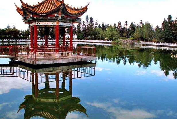 公園始建于80年代,建筑面積7畝,其中心是一泓近10多畝的水潭。池邊廣植銀樺、雪松、垂柳等,四周有藤架、大理石桌凳、大理石長欄,小溪繞潭。水池西側(cè)有大理碑亭,過亭沿曲廊行數(shù)米,可達水中的漾波亭。
