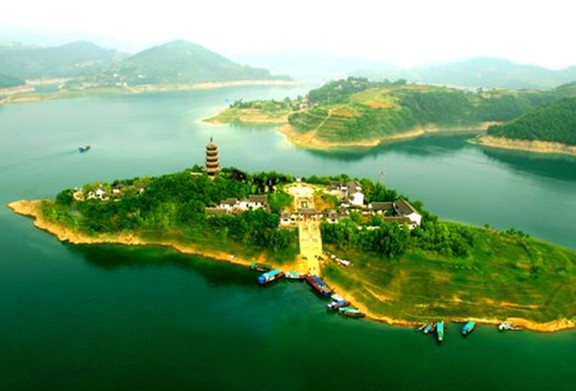 從空中俯看象一只美麗的孔雀開屏,四周又在青山綠水碧波之間,因此取名翠屏島。從安康乘車經(jīng)瀛湖鎮(zhèn)入進(jìn)島路全長(zhǎng)30公里,距金螺島僅一公里。