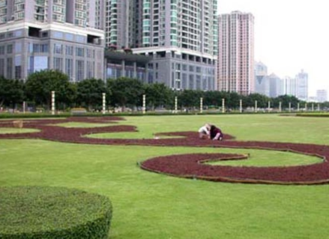 天河?xùn)|站綠化廣場位于廣州市新城市軸線上,占地面積4.7萬平方米,于1998年9月中旬動工,1999年7月1日正式完成并交付使用。廣場中央綠地2.6萬平方米,鋪種馬尼拉草18315平方米,其中有6000平方米種植標志性的紋樣,分圍種植1300平方米的福建茶綠籬。
