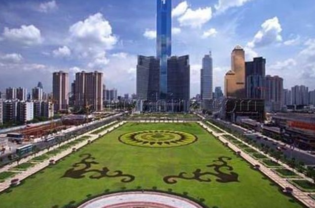 廣場的南面是廣州第一高樓中信廣場。中信廣場的主體建筑中信商業(yè)大廈是一棟甲級智慧型的商廈:主樓大堂入口處卓爾超凡,大堂樓高17.7米,配襯著優(yōu)質(zhì)花崗巖石,顯得格外富麗堂皇。除主樓外,兩翼還有藝術(shù)對稱的兩棟38層副樓以及5層裙樓(為中天購物城)。平面看來,主樓四方形,中天購物城的5層裙樓,呈半圓形,左右副樓則像電視卡通片人物伸出來的左手臂和右手臂。
