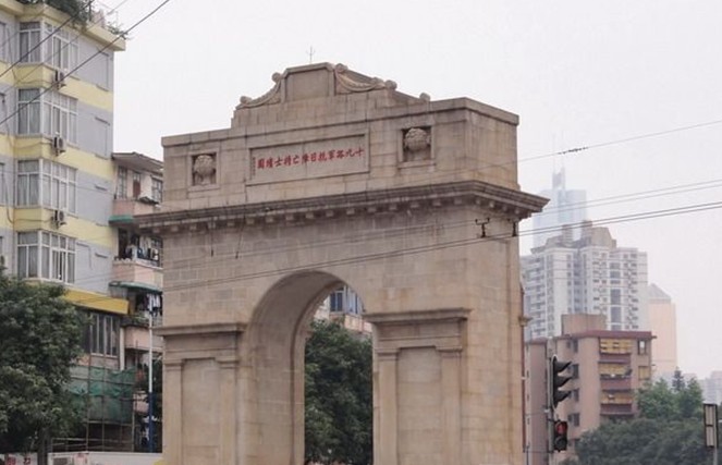 陵園有一座花崗巖砌成的仿羅馬紀(jì)功式建筑凱旋門。門樓建于1932年,位于沙河頂、先烈路和水蔭路的交會(huì)處,高13.4米,寬 11米,占地面積 40.7平方米。門額正面鐫刻著原國民政府主席林森所題的“十九路軍抗日陣亡將士墳園”,背面鐫刻國民政府行政院長宋子文題寫“碧血丹心”。