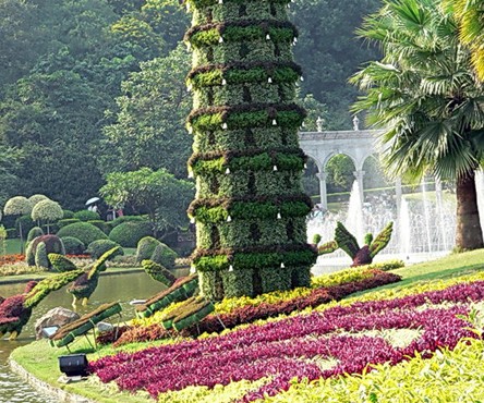 滟湖的水沿中軸線下瀉,使得滟湖成為中軸線的源頭,為了突出這一源頭,園林設(shè)計(jì)者和建造者又在滟湖的岸邊,建一羅馬柱廊,既突出了軸心線上的景點(diǎn)在云臺(tái)花園的作用,又與具有東西合璧特色的花園大門相對(duì)應(yīng)。版權(quán)所有山東聊城聊之旅國(guó)際旅行社有限公司,轉(zhuǎn)載必究!更為有趣的是,建造者借鑒了蘇州園林中花墻的效果,在羅馬柱廊的后面又安放了一群圖騰石柱。在軸心線的兩側(cè),云臺(tái)大花園分別排列出不同的功能區(qū),200多種中外名貴四時(shí)花卉就被巧妙地種植在不同的功能區(qū)里。東側(cè)在種植各種花卉的同時(shí),還依地勢(shì)起伏培植了大面積的草坪,遠(yuǎn)遠(yuǎn)望去,酷似一條綠色的瀑布。西側(cè)是誼園和茶室。誼園中心是一巨大地球石雕,以地球石雕為圓心,在一個(gè)巨大的圓周內(nèi),分布著已與廣州結(jié)為友好城市的市花和友好城市所在國(guó)的國(guó)花。