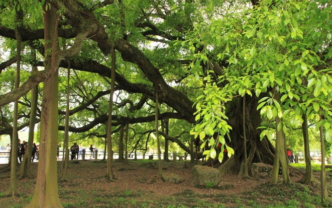 陽朔大榕樹矗立在金寶河畔,它的樹圍竟有七米多,高達十七米,枝繁葉茂,濃蔭蔽日,所蓋之地有一百多平方米。相傳已有千年歷史,雖然樹干老態(tài)龍鐘,盤根錯節(jié),但仍然生機勃勃。在電影里,劉三姐就是在這棵樹下向阿牛哥吐露心聲,拋出傳情繡球的。版權所有山東聊城聊之旅國際旅行社有限公司,轉載必究!大榕樹公園位于陽朔城南7.5公里的高田鎮(zhèn)穿巖村的金寶河南岸。大榕樹樹高17米,圍7.05米,覆蓋面積100多平方米。樹冠呈圓形,遠望似一把綠傘,近看盤根錯節(jié),葉茂蔽天。相傳此樹植于晉代,距今已有1500多年。進入了古榕公園以后,當您在冠如華蓋的巨大樹蔭下,慢慢端詳,細細品味。此時,您神清氣爽,身心俱靜,能夠感受到這神靈之樹如母親般對您的安撫和慰藉,深深沉浸在這綠色的愛意和溫馨之中,塵世間的憂愁與煩惱頓時消失殆盡。您看著眼前這棵虬根如虹,挺拔蒼勁,枝繁葉茂的千年古榕,如同看著一位鶴顏童發(fā)、面容安詳?shù)陌贇q老人,心中充滿了敬意與感慨。您想到人世間的悲歡離合,生命中的風云際會,時間里的滄桑與感動,您可能還會想到很多很多。導游或者純樸的當?shù)卮迕駮嬖V您,相傳古榕樹為唐代所種植,至今已有一千四百多年的歷史。古榕樹高達十七米,樹圍七米多,可以投下一千二百六十平方米的陰涼。版權所有山東聊城聊之旅國際旅行社有限公司,轉載必究!您想,這是怎樣一種精神境界,又有著多么頑強的生命力啊。還有那十余米長,一米多粗的貼地橫出的樹干,如巨人伸出一只力舉萬鈞的手臂,又似一條蓄勢待發(fā),急欲騰飛的巨龍。那藤蔓交錯的虬枝,那在微風中如珠簾般飄拂的須根,無不使您心旌神搖,產(chǎn)生無窮遐想。