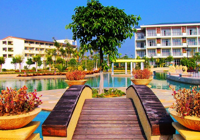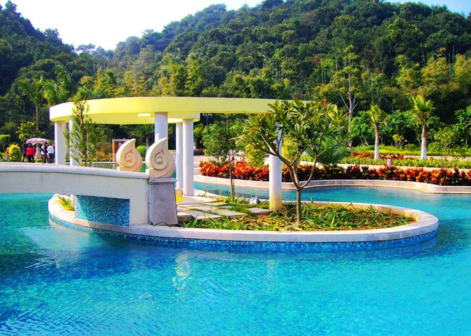 度假區(qū)總占地面積為1000畝。其中首期工程占地面積為500畝,其中設(shè)有別墅區(qū)、溫泉區(qū)、餐飲區(qū)、娛樂區(qū)、健身區(qū)、休閑區(qū)等項(xiàng)目。區(qū)內(nèi)有十分豐富的溫礦泉水資源,溫泉出口處水溫高達(dá)82攝氏度,富含大量鈣、鎂、氡等幾十種對人體有益的微量元素,對風(fēng)濕病、腰肌勞損、腸胃病、神經(jīng)性骨痛等多種潛在疾病有顯著療效。目前該度假區(qū)已完成首期工程,并已于2005年9月26日正式對外接待游客。度假區(qū)內(nèi)綠樹成蔭,小河流水,小島別墅區(qū)的形狀猶如一把西施扇,把整個(gè)度假區(qū)置身于群山的懷抱中。區(qū)內(nèi)設(shè)施配套齊全,目前設(shè)有575間客房、31棟別墅、三個(gè)中餐廳(同時(shí)可容納1650人)、兩個(gè)西餐廳、歌舞廳、溫泉大浴池、桑拿,以及為顧客提供咖啡廳、茶藝?yán)取⒊?、精品屋、大堂吧、游泳池、桌球室、乒乓球室、羽毛球室、大型的高爾夫練球場、網(wǎng)球場、健身房、沐足等各種服務(wù)設(shè)施一應(yīng)俱全。