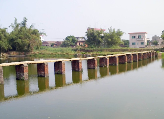 沿著彎彎的鄉(xiāng)間小路,可來到古勞水鄉(xiāng)一處名叫“二渡橋”的地方。只見前面的圍墩上,有幾棵百年老榕,靜靜地鎮(zhèn)守和護衛(wèi)著這一方水土。榕蔭下,幾塊長條花崗巖石條曲曲折折地架在魚塘邊的木樁上,頗有一種“小橋流水人家”的韻味。這種花崗巖石條,當?shù)厝朔Q它“條石”或“西樵石”。因水鄉(xiāng)的泥土細滑,不易滲水,偶爾幾滴小雨,這里便遍地泥濘,行走不便。于是居民們便用這種“條石”沿著小河涌和糖基鋪路,形成了遍布水鄉(xiāng)的石板小橋和石板小路,構(gòu)成一幅獨特的風(fēng)景。