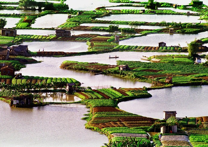 古勞堤內(nèi)水網(wǎng)縱橫交錯,小艇穿行如梭,兩岸蕉林搖曳,萬畝魚塘似明鏡耀目,千頃桑地綠海翻波,那青青的田疇就像精雕的翡翠,好一派旖旎的南國水鄉(xiāng)風(fēng)光。