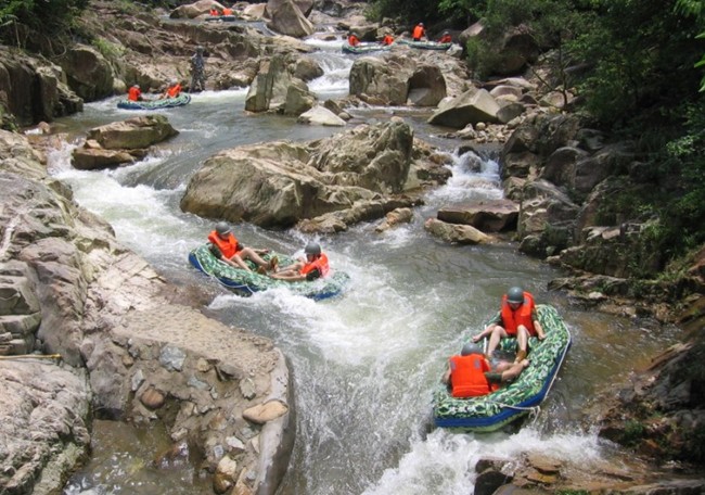 戰(zhàn)船隨著洶涌的河水奔騰而下,峽谷兩側(cè)炮聲隆隆,槍聲不斷,烽煙滾滾,還不時有敵人憑著叢林和怪石作掩護(hù)向我小分隊(duì)襲擊。當(dāng)然了,我們勇敢的戰(zhàn)士也毫不猶豫地用手中槍(水槍)予以還擊。在不斷的突破、穿越敵陣的緊張征程中,有著革命樂觀主義精神的戰(zhàn)士們不忘享受穿越激流險(xiǎn)灘時的激情澎湃和領(lǐng)略漂浮于平緩流水時兩岸風(fēng)光盡收眼底的詩情畫意。順流而下,四周山巒起伏,奇峰異石;峽谷峭巖跌宕,鬼斧神工;河道石貌多姿,溪水清澈;兩岸林茂竹翠,花香鳥語;沿途飛瀑奇巖,清溪幽泉,組成一幅美妙的大自然圖畫,恍如置身桃花源中,步入人間仙境。版權(quán)所有山東聊城聊之旅國際旅行社有限公司,轉(zhuǎn)載必究!經(jīng)過一個多小時的戰(zhàn)火征程,3.3公里的航程,戰(zhàn)友們感受了大地的歡歌、生命的激情,終于完成了任務(wù)(到了總部終點(diǎn))。