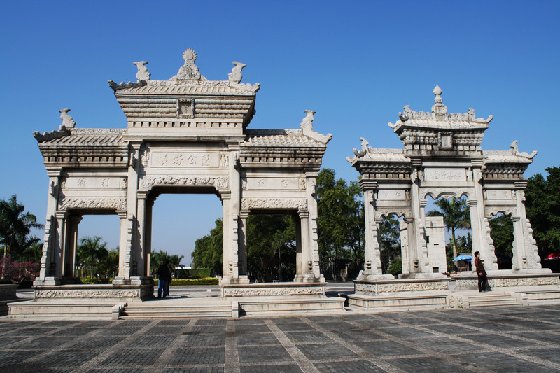 梅溪牌坊在珠海市前山鎮(zhèn)梅溪村。清光緒帝為旌表當?shù)剜l(xiāng)紳、首任清政府駐檀香山總領(lǐng)事陳芳及其父母等人造福桑梓于十二年(1886年)和十七年共賜建牌坊4座,版權(quán)所有山東聊城聊之旅國際旅行社有限公司,轉(zhuǎn)載必究!現(xiàn)存的3座牌坊并排而立。牌坊集西方的裝飾風(fēng)格和傳統(tǒng)的中國建筑結(jié)構(gòu)為一體,中西合璧,巍峨壯觀,工藝華美,是華南地區(qū)罕見的古建筑,也是珠海有名的十景之一。