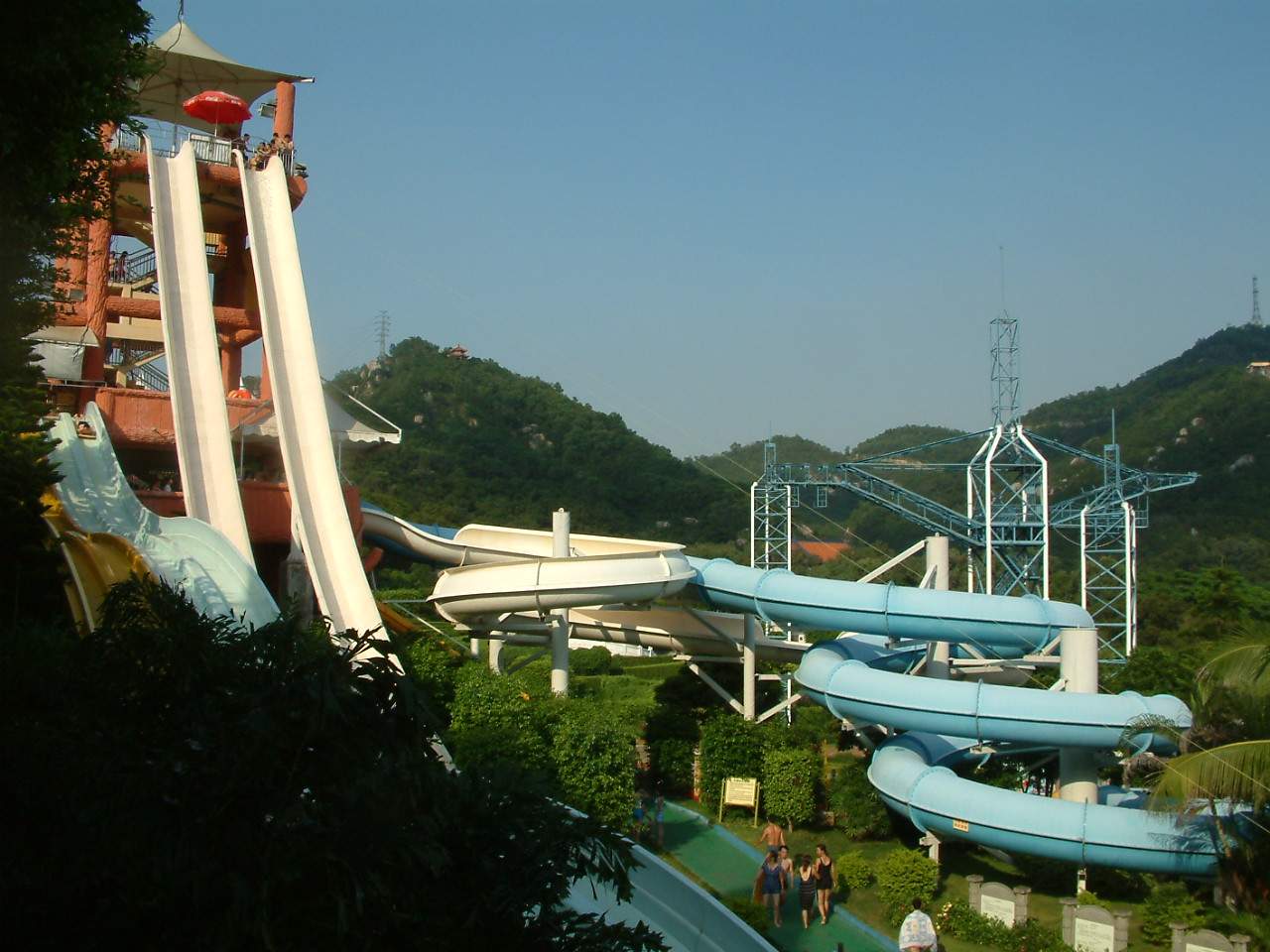 一千零一夜――滑道區(qū)。包括平等競賽滑道、螺旋滑道、大型俘筏水滑道和高速滑道。其中高速滑道是兩條并列的高達8層的樓高的高速滑梯,從頂端滑下來僅需2.6秒,頗有從云端滑落的感覺。