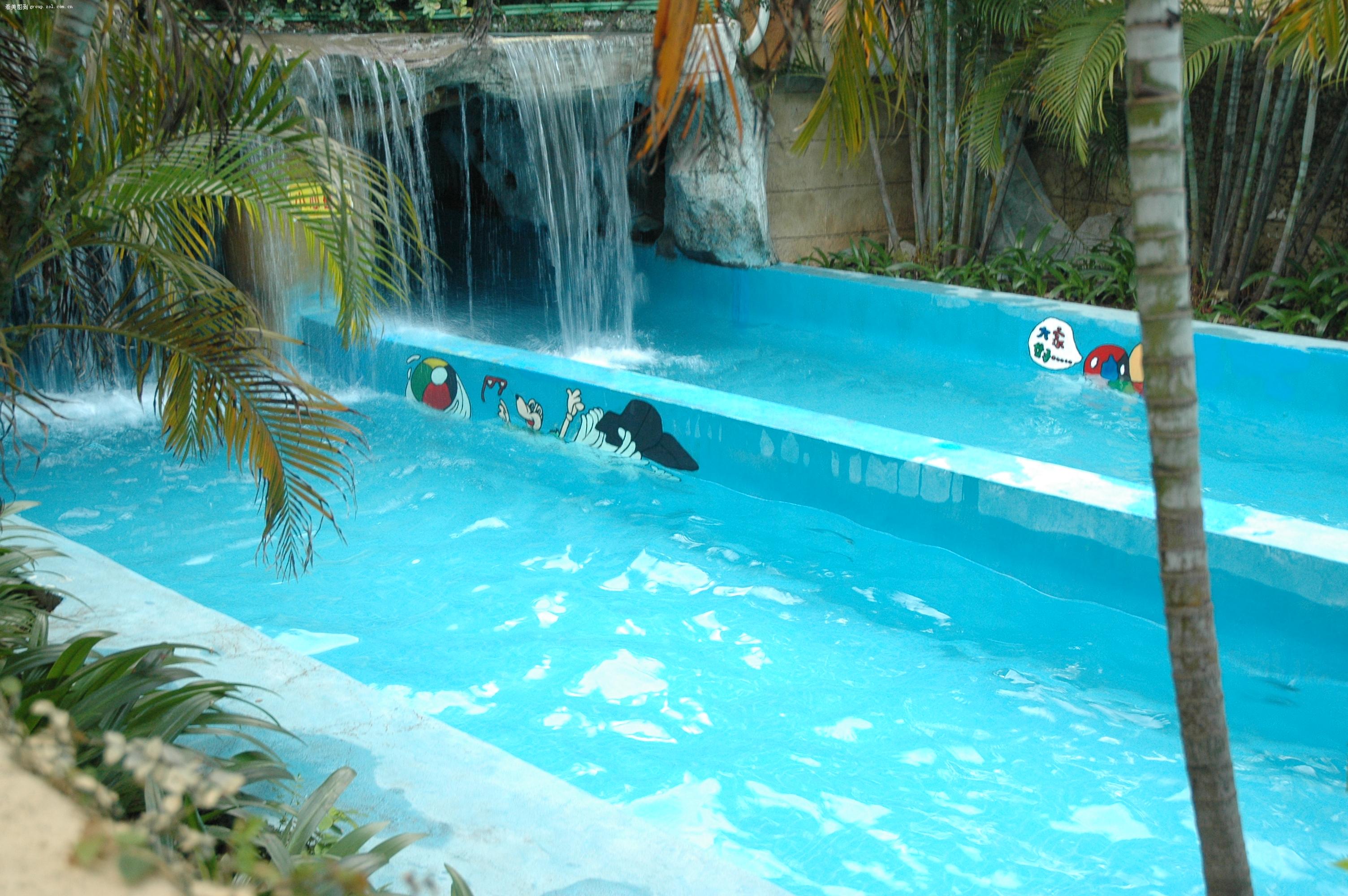 二、濃蔭蔽日、棕櫚搖曳的南國風情使人心曠神怡。 闊別一冬的夢幻水城已經成為一個濃蔭蔽日、棕櫚搖曳的綠色的世界,漂流河、兒童池、滑道以及情侶池等被綠蔭所掩蓋,那些爬藤植物使所有的遮陰棚看起來象一座座涼爽的小屋,使“古老的廊堡”更添滄桑感。在一片綠色的世界下面,潔凈的水汩汩而流,水槍水炮在樹逢里噴射,這是一個真正的清涼世界。