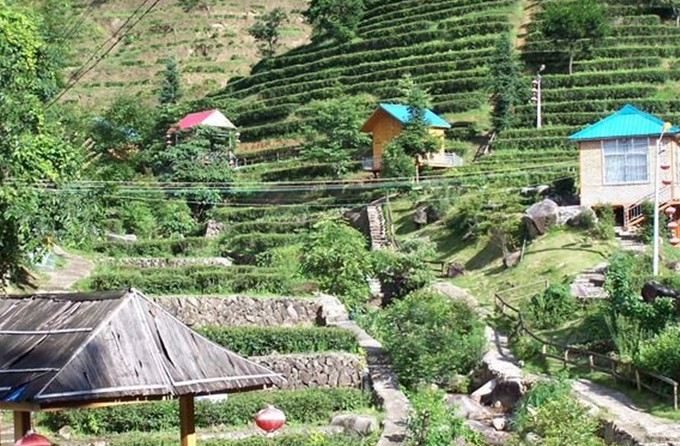 7、西巖山北坪:位于崗頭村西側(cè)1km處,這里是當(dāng)年抗日時(shí)期劉永生北江縱隊(duì)扎營(yíng)的地方,也是楓朗鎮(zhèn)的茶業(yè)專業(yè)村。這里有山峰、民居、茶樹(shù)梯田景觀,因山坡陡而長(zhǎng),梯田的級(jí)數(shù)有30級(jí)之多,讓游客震撼。