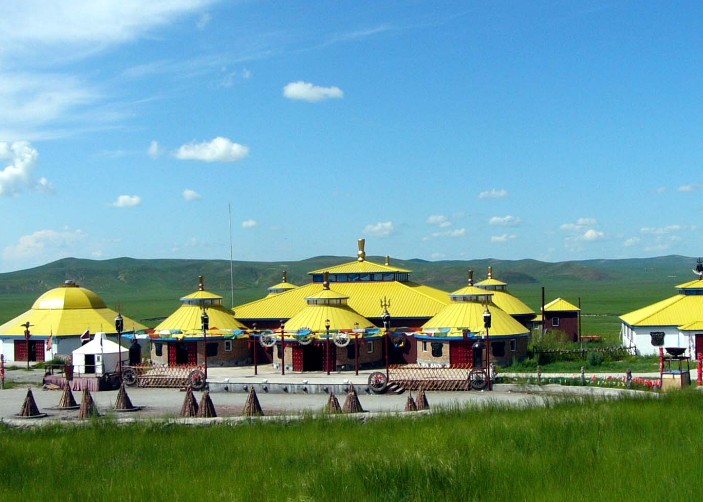 金帳汗旅游部落始建于1994年,是以部落樣式為主體,聚集了以蒙古民族為主的北方少數(shù)民族傳統(tǒng)文化、民俗民風(fēng)、宗教藝術(shù)、餐飲等綜合旅游服務(wù)景區(qū)?,F(xiàn)有固定資產(chǎn)200余萬(wàn)元,占地面積100萬(wàn)平方米。服務(wù)區(qū)以蒙古民族特色古樸典雅獨(dú)特風(fēng)格的282平方米的磚木結(jié)構(gòu)的蒙古包為主,周圍環(huán)繞坐落成吉思汗金帳、鄂倫春撮羅子、七星帳蒙古包群和達(dá)斡爾山莊,還有400多平方米的民族文化多功能涼廳和600平方米多功能觀賞博克擂臺(tái)、民族歌舞篝火晚會(huì)場(chǎng)等??赏瑫r(shí)接待1000余人就餐,100余人住宿;可舉辦大型民族體育賽會(huì)和大、中、小型歌舞表演、篝火狂歡晚會(huì)等娛樂(lè)活動(dòng)。設(shè)有馬隊(duì)迎賓、套馬表演、馴馬表演、馬群瞬間攝影、祭敖包、蒙古族博克表演、鄂倫春、鄂溫克、達(dá)斡爾三少民族民情演示、訪牧戶體驗(yàn)生活、騎馬、騎駱駝攝影、騎馬觀光、乘勒勒車、米日桿車觀光、篝火狂歡晚會(huì)、民族歌舞表演、射箭、打彈弓、飛鏢等活動(dòng)項(xiàng)目,已達(dá)到了游、行、住、食、娛、購(gòu)六大要素為一體的大型民族民情、民族文化的草原景點(diǎn)。