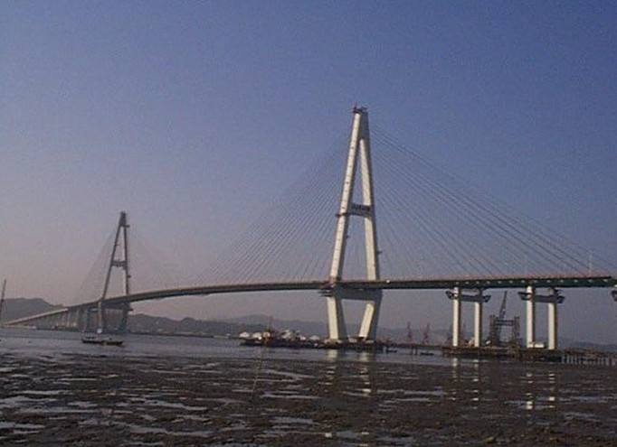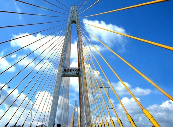 大橋為鋼筋混凝土斜拉橋,全長3500米,比海灣大橋長1000米,橋寬30米,雙向6車道,主橋兩側設觀光人行道,主跨通航凈高38米,比海灣大橋低l米。