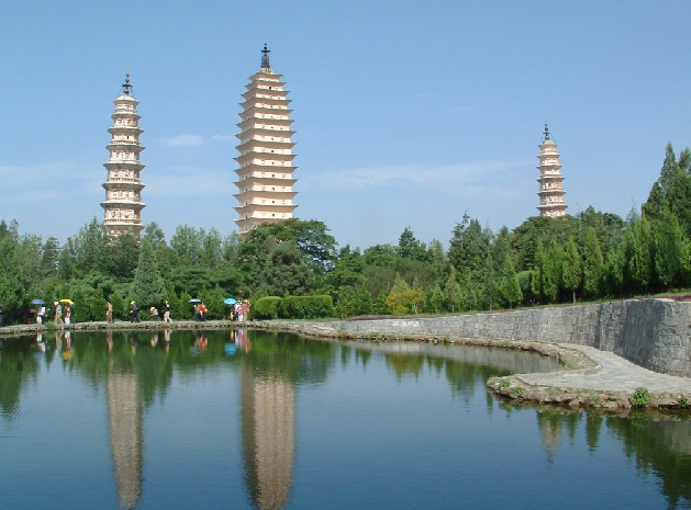 三塔崇圣寺始建于唐開元間(公元713—741年),先建了大塔“千尋塔”,高69.13米,是座方形密檐式磚塔,共13層。稍后又建了南、北小塔,均高43米,是一對八角形的磚塔,都是10級。三塔渾然一體,氣勢雄偉,具有古樸的民族風格。