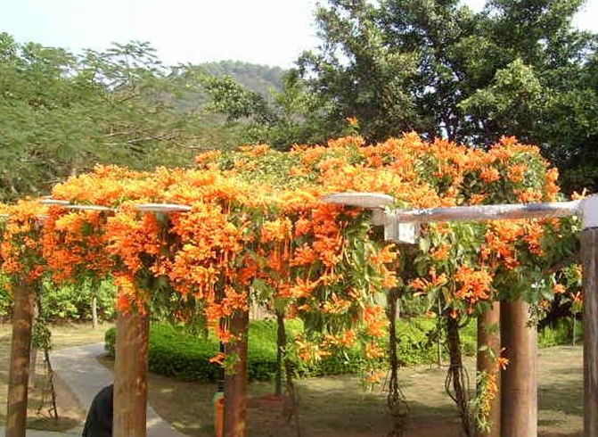 人工疏林草地植被樹木種類較多,層次較簡單,林木主要有南洋楹、檸檬桉、白千層、鳳凰木、蒲葵等20多種,林下植物主要以毛杜鵑、龍船花等植物為主;園內(nèi)綠化特色樹種為美麗異木棉、宮粉紫荊等植物。緩坡地種植的毛杜鵑每到開花季節(jié)漫山一片通紅,景色非常優(yōu)美。環(huán)山路邊的二喬木蘭、美麗異木棉,到了開花季節(jié)沿路色彩斑斕,自然景觀非常壯麗。“2002-2003年,靠北環(huán)路邊以杉木、馬尾松、馬占相思為主的人工林,由于結(jié)構(gòu)單一,并已老化,已進行了林分改造,在保留鴨腳木、山烏桕、野漆樹等具有景觀效果的野生樹種,混交配置了鳳凰木、大葉紫薇、火焰木、美麗異木棉、宮粉紫荊、紅花荷等骨干樹種,形成了層次鮮明,景觀效果高的生態(tài)風景林。山脊線主要是以荷木、大葉相思、臺灣相思組成的防火林帶。”筆架山公園管理處負責人向記者介紹,“為給廣大市民呈現(xiàn)多姿多彩的公園景象,我們在2003年沿北環(huán)繞路邊山體種植了彩色林、紫荊花樹,改變公園單一色彩,興建彩色林帶。”現(xiàn)在,公園綠化面積40多萬平方米,種植喬灌木5萬多株,形成層次明顯、色彩較為豐富的景觀。
