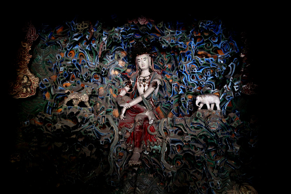 殿內(nèi)正中佛壇上,塑有釋迦牟尼、文殊、普賢、阿難、迦葉像,其中一佛(釋迦牟尼)、二弟子(阿難、迦葉)像為宋代原塑。檐墻及圍繞佛壇的扇面墻上,均繪有明代成化年間繪制的壁畫,題材內(nèi)容為佛傳故事。壁畫色彩艷麗,線條流暢。扇面墻背面塑有玲瓏別致的須彌山,山間塑有羅漢、獅、象等,中部有一尊明代彩塑觀音坐像,頭戴寶冠,肩披瓔珞飄帶,胸臂裸露圓潤,一足踏蓮,一足踞起,雙手撫膝。鼻梁微高,柳葉細(xì)眉,面容恬靜安詳,姿態(tài)優(yōu)雅端莊;實(shí)為中國古代彩塑杰作。