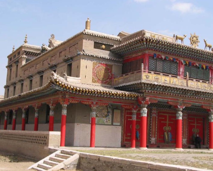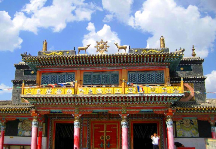 但那個(gè)時(shí)候,噶爾丹是朝廷的罪人,是不能大事鋪張的。所以,這個(gè)可憐的女人,就把噶爾丹的遺體簡(jiǎn)單地埋葬在希拉穆仁河邊。這座墳?zāi)?,十有八九就是今天召河(希拉穆仁)?zhèn)所在地西南一公里的王墓。版權(quán)所有山東聊城聊之旅國(guó)際旅行社有限公司,轉(zhuǎn)載必究!此是后話,按下不提。掩埋了丈夫的遺骨,帶著丈夫的遺孤,藍(lán)琪兒遠(yuǎn)遠(yuǎn)地離開(kāi)了希拉穆仁,回到養(yǎng)育了她丈夫的故地,潛心撫育她心愛(ài)的兒子??滴跞f(wàn)歲爺雖然消滅了噶爾丹,但對(duì)于藍(lán)琪兒的命運(yùn)仍十分關(guān)注。也是命里注定,席力圖召的五世活佛圓寂了。六世活佛應(yīng)該轉(zhuǎn)世在哪里?萬(wàn)歲爺派遣密使,前往西藏,如此這般。不久,席力圖召大喇嘛得到旨意,到喀爾喀蒙古尋找,最后,找到了噶爾丹的遺孤、藍(lán)琪兒的兒子,將他命名為阿嘎旺老布生達(dá)瓦,成為席力圖召第六世活佛。以后的事情,正如您已經(jīng)知道的,席力圖召六世活佛在希拉穆仁河畔建造了這座規(guī)模宏大的普會(huì)寺。普會(huì)寺的大門(mén)與王墓遙遙相望。他的目的,一方面是將其作為席力圖召的夏季避暑勝地;另一方面,則是為了讓他父親的亡靈,永遠(yuǎn)得到佛教的護(hù)佑。