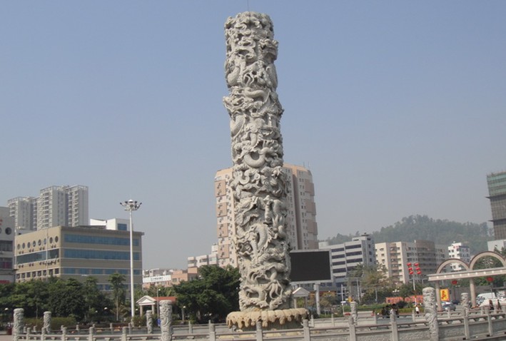 廣場(chǎng)分為三個(gè)區(qū)域:北端是集會(huì)區(qū),以半圓形主席臺(tái)為標(biāo)志,可舉行大型演出或舞會(huì);中部是游覽區(qū),建有大型白色花崗巖石雕九龍柱,高19.99米、直徑3米、雕刻浮度為60厘米,總重量為260噸,配置噴水池直徑28米,水池周邊采用花崗巖“二龍戲珠”浮雕扶欄,欄間嵌有8條1.99米高小龍柱。噴水由里向外形成落差,分段迭灑,錯(cuò)落有序。