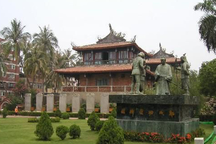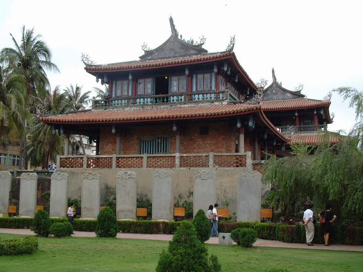 1862年(清同治元年)毀于大地震,光緒年間在廢墟上建文昌閣、海神廟等,即今日的赤嵌樓。樓內(nèi)陳列著荷蘭人投降的條約書,以及鄭成功與荷軍作戰(zhàn)的海圖等珍貴歷史資料。城樓下排列著九座巨大貝屃碑趺的石碑,為乾隆皇帝所賜,上面刻有乾隆親撰的碑文。赤嵌樓的樓上,尚有巨炮及瞭望臺的遺跡。樓前廣場中心建有鄭成功接受荷軍獻降書的雕塑群像。這受降圖是勝利的象征,顯示了中華民族的雄風(fēng)。