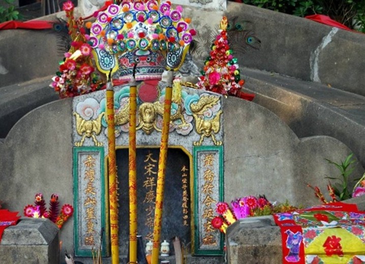 碑后為墳堆,有兩重弧形圍墻,前段中間頂面塑祥云拱月,涂染朱紅,后段頂面塑雙龍拱日,下有一只鳳鳥裝飾。墓的東側(cè),立有一塊泉州白石碑,正面是《宋帝昺陵墓碑記》,記敘了宋少帝的生平、陸秀夫負帝殉海的經(jīng)過以及陵墓的修建情況,碑文為篆體陰文,風(fēng)格古拙,是著名書法家商承祚所寫。石碑背面則刻有著名書法家秦萼生題筆的八個大字:“崖海潛龍,赤灣延帝”,字體蒼勁。陵墓西側(cè),版權(quán)所有山東聊城聊之旅國際旅行社有限公司,轉(zhuǎn)載必究!是一座高約四米的陸秀夫負帝殉海石雕像,民族英雄陸秀夫背負幼主,視死如歸,凜然正氣,令人肅然?;蛟S,正是陸秀夫這種寧死不屈的民族氣節(jié)的感召,不時還有世人前來拜祭。在少帝陵前,在陸秀夫像前,擺滿了豐盛祭品,縈繞著裊裊香煙……