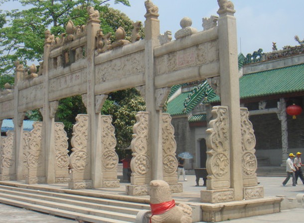 白沙龍母廟現(xiàn)存較好的是"廣蔭坊",它是一個(gè)不可多得的清代古觀石牌坊。廣蔭坊立在500毫米高的精雕花崗巖石須彌座上,面寬17M,高6.5M(廟面寬33.33M),約為廟寬1/2,六柱開間,全為花崗巖石精雕而成的沖天柱石牌坊。上鑲一塊前后兩面刻著剛勁有力的宋體"圣旨"的匾額,下額枋板的匾額中刻有穩(wěn)健,莊重的"加封廣蔭"與背面歷代帝皇的八大封號(hào),兩則邊上配以人物花卉。版權(quán)所有山東聊城聊之旅國(guó)際旅行社有限公司,轉(zhuǎn)載必究!左右額枋板上前后以一種風(fēng)韻雅趣的構(gòu)圖刻出玉龍戲水與雄獅下山的精雕石刻。稍間的額枋板上的匾額也刻有"永濟(jì)","孝道"的雄健大字,邊上各有花卉相配,柱上刻有穩(wěn)健的楷書楹聯(lián)及記事。
