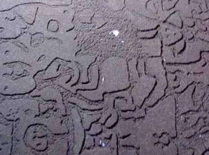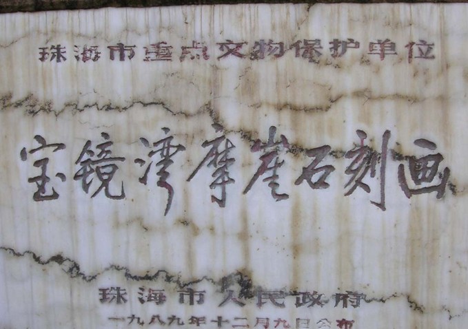 寶鏡灣摩崖石刻畫,位于廣東珠海市高欄島寶鏡灣,于1989年10月被發(fā)現(xiàn),共4處6幅,散布于海灣所在的山腰、山麓200米范圍內(nèi),其中最大的一幅長5米、高3米。巖畫陰刻于大塊平整的石面上,圖案密集而復(fù)雜,形狀有船、波浪、龍蛇、舞蹈人等,經(jīng)專家考證,是距今二三千年前青銅時代的產(chǎn)物,是南越先民生活的寫照。