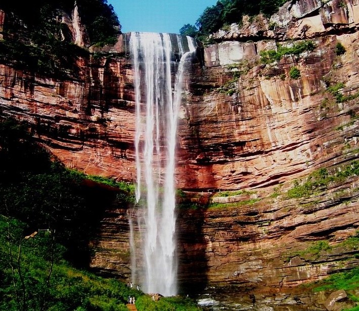 此瀑宛如一條潔白的哈達(dá),懸垂于綠樹(shù)紅巖之中。瀑布高約89米,寬約9米。三面赤壁環(huán)回,將銀瀑揉成簇簇絮團(tuán),版權(quán)所有山東聊城聊之旅國(guó)際旅行社有限公司,轉(zhuǎn)載必究!斜飄深谷,形成節(jié)節(jié)梯形水簾,陽(yáng)光射水霧,彩虹凌空,煙霧滿谷,蔚為奇觀。