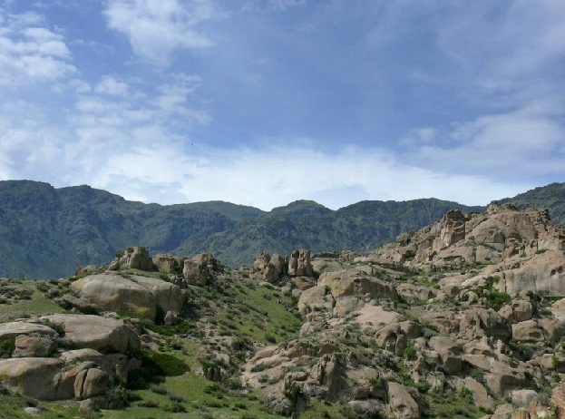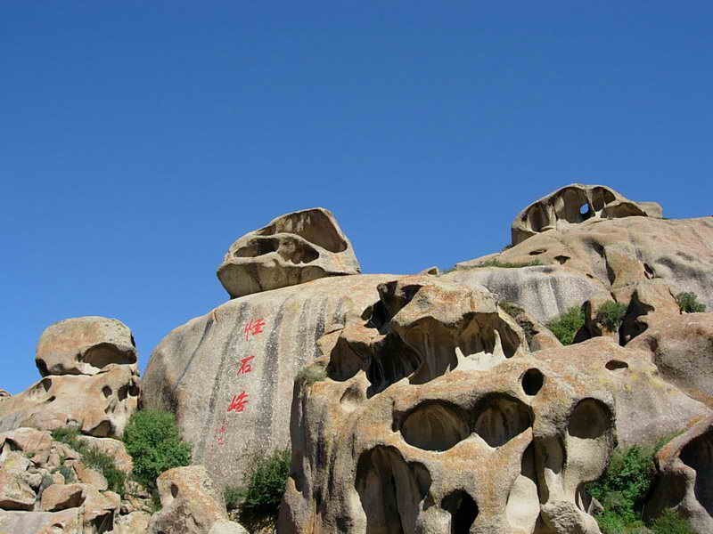 從博樂(lè)市北行偏東行38公里,就到了怪石峪。 怪石峪為一峽谷,然谷內(nèi)無(wú)懸崖峭壁,也無(wú)峨峰刺天。整個(gè)山體,如人工用億萬(wàn)巨石所砌。所砌之石,皆呈圓角,且有竅孔,石面光滑,無(wú)嶙峋之跡,令人稱怪,故稱“怪石峪”。當(dāng)?shù)毓_克族同胞稱怪石峪為“闊依塔什”,意思是“遍地像羊一樣的石頭”。因?yàn)檫@些光滑的巨石,遠(yuǎn)遠(yuǎn)望去,如同羊群擠在山坡。