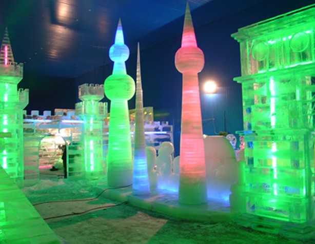 現(xiàn)代獨特的冰質(zhì)造型藝術(shù)與冰景造園藝術(shù),是冰城人開發(fā)利用冰雪資源最為突出的成就之一。它以松花江天然冰、自來水和各種電燈為材料,用砌筑、堆壘、雕刻、噴澆、冷凍和鑲嵌等方法,根據(jù)特定的主題需要和總體布局安排,在不同的園林空間加工出有關(guān)的冰景,冰建筑、冰雕塑、冰 瀑布、冰花壇、冰滑梯、冰書法、冰盆景、冰廣告、冰凍花、冰罩燈,組成若高低錯落、疏密有致的不同景區(qū),形成步步有景、步移景易的冰雪園林,同時配置各種燈光,增加動的成份,輔以音響效果,達到形、光、動、聲的和諧統(tǒng)一。冰燈藝術(shù)是以冰為載體,以燈為靈魂,融繪畫、雕塑、建筑、園林、文學(xué)、音樂等多種藝術(shù)于一身,并可運用光學(xué)、力學(xué)、聲學(xué)及電氣、機械等科學(xué)技術(shù)的新興的造型藝術(shù)。運用這種藝術(shù)形式創(chuàng)造出的珠宮琳館、瓊榭瑤橋、銀雕玉塑、冰山雪嶺、冰凌冰瀑,白晝間千姿百態(tài),晶瑩剔透,入夜后流光溢彩,萬紫千紅,象撲逆迷離的仙山瓊閣,似如夢如幻的水晶宮闕,且年年出新意,歲歲景不同,被稱為"永不重復(fù)的童話世界"。冰雕,即是冰燈中的一個品種,又是一種獨立的藝術(shù)形式。哈爾濱每屆冰雪節(jié)期間,都要分別組織職工、家庭、少年兒童和全國中學(xué)生以及國際性的冰雕比賽,比賽產(chǎn)生的數(shù)百件作品姿態(tài)各異,生動傳神,巧奪天工。
