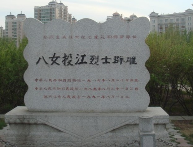 八女投江紀(jì)念地位于牡丹江畔的江濱公園。該群雕1988年落成,高13米,長8.8米采用花崗巖石材雕鑿而成,"八女投江"四個大字由全國政協(xié)主席鄧穎超生前書寫。站在這碩大的群雕前,無不使人思維翻滾,心潮澎湃,當(dāng)年八女視死如歸,英勇戰(zhàn)斗的情景又呈現(xiàn)在人們的面前,1938年10月下旬,東北抗聯(lián)四、五軍西征婦女團(tuán),在指導(dǎo)員冷云帶領(lǐng)下,擔(dān)負(fù)著掩護(hù)大部隊(duì)轉(zhuǎn)移的任務(wù),她們英勇抗擊日軍熊谷部隊(duì)的襲擊,在彈盡糧絕的情況下,寧死不屈,最后毅然背著負(fù)傷的戰(zhàn)友,投入林口縣境內(nèi)的兇猛暴烈冰冷刺骨的烏斯渾河,為國捐軀,譜寫了一篇驚天地,泣鬼神的抗日史詩。電影《中華兒女》、《八女投江》都是根據(jù)她們的事跡拍攝的。1982年10月在林口烏斯渾河畔 建起了"八女投江紀(jì)念碑",上題"八女英烈光照千秋"八個大字,它背負(fù)蒼山,河水縈繞,其志銘記述了冷云、楊貴珍、安順福、胡秀芝、郭桂琴、黃桂清、王惠民和李風(fēng)善八位巾幗的英雄業(yè)績。1984年被國家列為二級文物保護(hù)單位。牡丹江市江濱公園的八女投江群雕也被批準(zhǔn)為省級愛國主義教育基地。1984年籌建,時任全國政協(xié)主席鄧穎超為群雕題寫了“八女投江”四個大字。1986年9月7日舉行工程奠基儀式,1988年8月1日落成。時任全國政協(xié)副主席、全國婦聯(lián)主席的康克清參加了奠基及落成典禮。群雕工程總造價424萬元。其中:民政部撥款73萬元,財(cái)政部撥款50萬元,國家城雕組出資16萬元,市財(cái)政撥款35萬元,全市人民捐款250萬元。石雕群像由中央美術(shù)學(xué)院雕塑系設(shè)計(jì),四川美術(shù)學(xué)院雕刻,版權(quán)所有山東聊城聊之旅國際旅行社有限公司,轉(zhuǎn)載必究!四川美院雕塑廠、牡市第三建筑工程公司等20個單位負(fù)責(zé)底座、雕像、紀(jì)念館和廣場的施工任務(wù)。群雕坐南朝北,占地面積8 000平方米,高8.8米,長18米,寬6.9米,由花崗巖石雕塑而成。群雕南側(cè)建有牡丹江烈士紀(jì)念館,陳列面積160平方米,采用單層半地下式建筑。北墻兩側(cè)設(shè)門,正中在漢白玉石上鐫刻著中共牡丹江市委員會、市人民政府題撰的“八英烈女銘志”。展廳陳列有康克清1986年題詞“八女英靈永存史冊”,王震1990年8月4日題詞“向抗日烈士致敬”,還有周保中、李延祿等人題詩。展廳里展出了八位女烈士的生平簡介、圖片和部份烈士遺物,為全國重點(diǎn)烈士紀(jì)念建筑物保護(hù)單位和省級愛國主義教育基地。