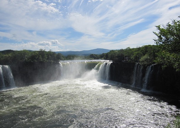 吊水樓瀑布,又稱鏡泊湖瀑布,它位于黑龍江省寧安縣西南,從牡丹江市向南經(jīng)古城寧安,再向西行抵達(dá)東京城后,從這里一直行駛30公里,便可抵鏡泊湖的北湖頭。瀑布幅寬約70余米,雨水量大時(shí),幅寬達(dá) 300 余米。落差 20 米 。它下邊的水潭深 60 米 ,叫“黑龍?zhí)丁薄C糠暧昙净蜓雌?,水聲如雷,激流呼嘯飛瀉,水石相擊,白流滔滔,水霧蒸騰出繽紛的彩虹。它形狀好像加拿大亞尼亞加拉大瀑布,是世界最大的玄武巖瀑布。