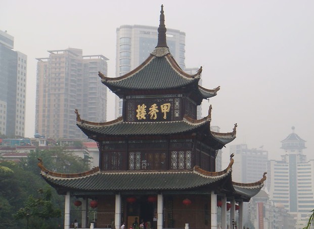 甲秀樓在貴陽市城南的南明河上,以河中一塊巨石為基而建。始建于明,后樓毀重建,改名“來鳳閣”。清代甲秀樓多次重修,并恢復(fù)原名?,F(xiàn)存建筑是宣統(tǒng)元年(1909年)重建的。樓上下三層,白石為欄,層層收進(jìn),由橋面至樓頂高約20米。南明河從樓前流過,匯為涵碧潭。樓側(cè)由石拱“浮玉橋”連接兩岸,橋上原有小亭一座叫“涵碧亭”,現(xiàn)已拆除。甲秀樓朱梁碧瓦,四周水光山色,名實(shí)相符,堪稱甲秀。