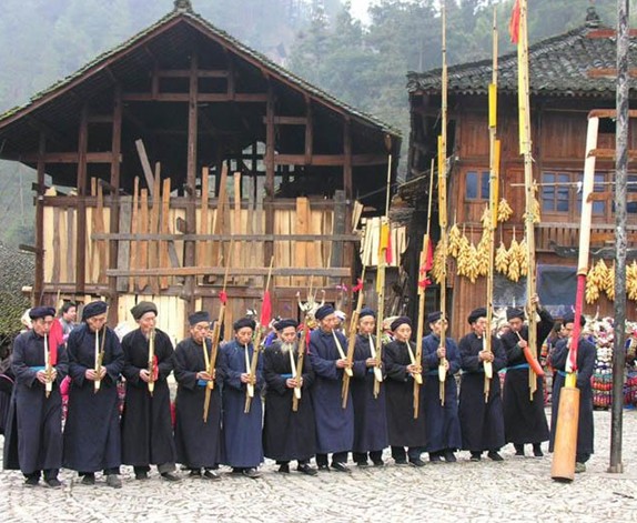 貴客進(jìn)郎德上寨得按苗家禮俗喝攔路酒。從寨腳公路開始,到寨頭的進(jìn)寨門樓,設(shè)迎客攔路酒卡,多達(dá)12道。每道酒卡,在路中間放一張方桌,兩邊站著幾個(gè)身著盛裝的苗族男女青年,提壺端杯,向客人敬酒,每道兩土碗,表示福壽雙全。最后一道酒卡是進(jìn)寨門樓,土碗換成了大牛角。如此一路想滿飲進(jìn)寨者,非“海量”莫能。不過不善飲酒的客人也不必?fù)?dān)心,只要你雙手背在身后,彎腰用唇輕觸酒杯即離,并有禮貌他說一聲“兜社莫”(苗語“謝謝你”)就可以“過關(guān)”了。主人雖然好客,但絕不會(huì)強(qiáng)人所難。歡迎儀式還有燃鐵炮、放鞭炮、奏莽筒、唱酒歌等。在這之后,婦女們身穿繡衣條裙,頭戴銀角冠,男子們則長袍馬褂,全村盡出,把客人引至寨中心蘆簽場。場上銅鼓高懸,青年鄉(xiāng)民在這里為客人獻(xiàn)上傳統(tǒng)的苗族歌舞:蘆笙舞、板凳舞、木鼓舞,銅鼓舞……最后,全村男女老少絡(luò)繹上場,圍成若干個(gè)同心圓,隨著銅鼓點(diǎn)子款款繞場起舞,客人們也被邀入場內(nèi),使狂歡活動(dòng)達(dá)到高潮。歌舞之后,可信步走人普通苗家,那“吱呀”的紡車,“嚓嚓”的布機(jī),講述著大山中寧靜的生活,熱情的村民定會(huì)邀你在吃新節(jié)或過苗年時(shí)再來,那是他們最隆重的節(jié)日。