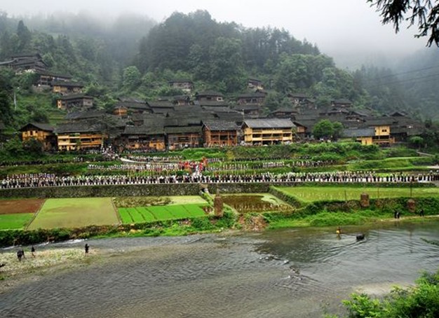 至今全寨有118戶,500多人,全部是苗族同胞,以陳、吳二姓為主。郎德上寨依山傍水,背南面北,四面群山環(huán)抱,茂林修竹襯托著古色古香的吊腳樓,蜿蜒的山路掩映在綠林青蔓中,悅耳動聽的苗族飛歌不時在曠野山間回蕩。寨前一條彎彎的河流宛如蛇龍悠然長臥,南面有松杉繁茂的“護寨山”,北面有楊大六橋---“風(fēng)雨橋”橫跨于河畔上。過橋可攀登養(yǎng)牛坡,還可觀賞楊大六當(dāng)年反清抗暴時筑起的碉堡和戰(zhàn)壕。寨內(nèi)吊腳樓鱗次柿比。吊腳樓上裝有“美人靠”供來客休息。“美人靠”平時又是姑娘們刺繡的好地方,具有獨特的苗寨風(fēng)格。村上的小路全以鵝卵石鋪設(shè),整整齊齊干干凈凈。寨子中央有一個大蘆笙場,地面是用鵝卵石以仿古代銅鼓面十二道太陽光芒和飛奔的駿馬,南上方還設(shè)有“楊大六文物博物館”。館內(nèi)陳列著當(dāng)年楊大六領(lǐng)導(dǎo)反清抗暴時的刀、叉、頭 盔、鐵炮等戰(zhàn)斗武器。原先苗族有自己民族文字,《苗族古歌》記載了苗族先民因逃避戰(zhàn)爭和朝廷的追殺與民族文化遷徙秘密等暴露予敵人,不得不將文字焚燒,抹去,當(dāng)僅有的那些為數(shù)不多的知識分子去世后,文字也隨之丟失,留下的只有現(xiàn)在的那寫在衣服上的文字。當(dāng)代苗族青年作家、知名記者南往耶這樣寫到:“苗族是一個不斷被驅(qū)趕甚至被消滅的民族,但他們一直沒有對信念和天主的放棄,自五千年前開始,爬山涉水,經(jīng)歷千難萬苦,從中原逃到云貴高原和世界各地,朝著太陽落坡的地方尋找故鄉(xiāng),用血養(yǎng)育古歌和神話,沒有怨恨,把懸崖峭壁當(dāng)做家園,梯田依山而建,信仰萬物,崇拜自然,祀奉祖先,感謝仇人。”進郎德上寨,首先要飲十二道攔路酒,然后才沿著石板小路走進寨子中央的蘆笙場。在郎德將會欣賞到敬酒歌、苗族飛歌、蘆笙 舞、銅鼓舞、板凳舞、集體舞等豐富多彩的苗族民間歌舞。或許,這就是苗族的文字吧。