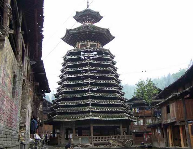 始建于清代康熙十一年(1672)秋。版權所有山東聊城聊之旅國際旅行社有限公司,轉載必究!該樓為木質結構,形如寶塔,雙葫蘆頂。高25米,占地面積160平方米。內(nèi)有4根大柱,每根直徑0•8米,高15米,每柱之間距離3.6米,構成椎形方架,是鼓樓的骨干部分。距4大柱外圍3米處,豎有8根高3.5米的支柱,將大柱團團圍住,并以穿枋與內(nèi)柱相連,呈輻射狀。一層樓上疊有數(shù)層,每層有8根短爪柱層層疊豎,直至第十一層。鼓樓頂部,還有兩層八檐八角的傘頂寶塔,名曰“干梗”,其工藝精細,為中國木質結構建筑中所罕見。在此層頂閣中,有一個長約3米,直徑約10公分的木鼓。最頂部嵌有陶瓷寶珠尖頂,直插云霄。頂閣下面各層梁上釘有橡皮,并用大小羊桃藤捶爛與石灰拌合架瓦,十分牢固。檐閣下畫有龍、鳳、魚、蟹、蝦等動物圖案,美麗壯觀。此樓的最低層嵌有3扇大門,正中設有一個火坑,周圍鋪青石片。該鼓樓為國家級重點文物保護單位。中國清代侗族建筑。在貴州省從江縣西北約50公里的增沖寨。據(jù)碑文記載,始建于清康熙十一年(1673),道光、光緒時曾維修。鼓樓系侗族特有的民俗建筑,是侗家聚眾議事、排解糾紛、迎送賓客、對唱大歌和吹笙踩堂等重大活動的場所。一般一姓建鼓樓一座,因此又是族姓的形象標志。增沖鼓樓既保存了中國古代建筑的特色,又具有濃厚的民族風格,規(guī)模宏大,造型美觀,工藝精湛,具有較高的價值。1988年中華人民共和國國務院公布為全國重點文物保護單位。1997年6月,國家郵電部曾發(fā)行《侗族建筑》一套四枚郵票,其中有一枚就是增沖鼓樓。由此可見增沖鼓樓在由數(shù)不清的鼓樓、花橋、戲臺和吊腳樓構筑的五彩繽紛的侗鄉(xiāng)建筑中所占的地位。