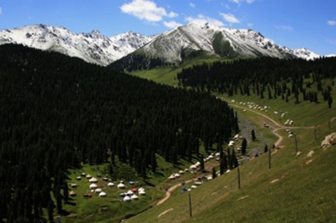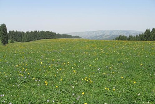 這是一處以生長大片金黃色菊花為特色的哈薩克草原牧區(qū)景觀旅游區(qū)。它位于西白楊溝的西側(cè),為一緩坡傾斜的洪積扇臺(tái)面,海拔2000~2400米。春夏季節(jié),臺(tái)面上菊花金黃,百花爭艷,蜂蝶紛飛,一派典型的天山草原風(fēng)光。菊花臺(tái)東側(cè)的中梁臺(tái)上建有與國際觀察水平接軌的中科院烏魯木齊天文臺(tái),我國最大的直徑25米的射電天文望遠(yuǎn)鏡。