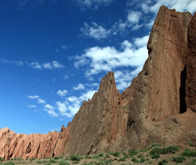天山神秘大峽谷地處天山山脈南麓、庫車縣城以北64公里的山區(qū),位于217國道1025.8公里處北側(cè),海拔1600米,最高山峰2048米。大峽谷由紅褐色的巨型山體群組成,當?shù)厝藗兎Q之為克孜利亞(維吾爾語意“紅色的山崖”)。峽谷南北走向,末端稍向東彎曲,全長5000多米,經(jīng)億萬年的風雨剝蝕、山洪沖刷而成,是我國罕見的自然風景奇觀。