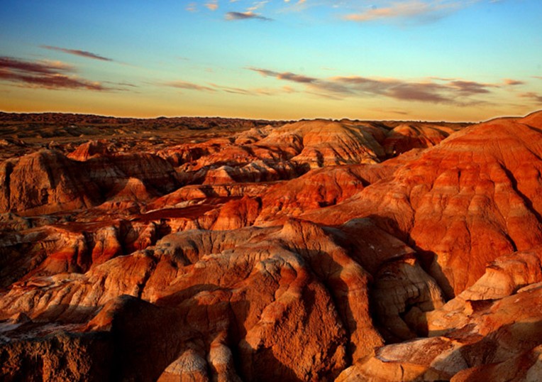 阿勒泰五彩城北距富蘊(yùn)縣城約280公里,海拔約650米。阿勒泰五彩城外觀屬丘陵地形,是受風(fēng)力和流水作用形成的侵蝕臺(tái)地,高一般10――20米,最高約50米,分布面積近10平方公里。 一般由傾角不大的侏羅紀(jì)地層構(gòu)成的阿勒泰五彩城,巖畫凹凸相間,巖石色澤多變,以紅為主,間以綠、黃、白、黑及過渡色彩,酷似五彩古堡。阿勒泰五彩城與烏爾禾魔鬼城的雅丹地貌相比更具有良好的視覺效果。
