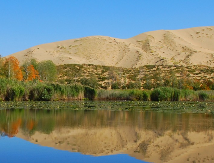 白沙湖,湖面只有0.5平方公里。是個獨(dú)立于浩瀚沙漠中的原生態(tài)沙漠湖,沒有進(jìn)水與出水口,沙漠里一般蒸發(fā)量都比較大,但這里的水位多年來卻沒有變化,更不因季節(jié)變遷而增多或減少。景致構(gòu)成十分獨(dú)特,湖中四周生長著高達(dá)1—4米的密密叢生的蘆葦、菖蒲等水生植物,湖中還有野荷花孤寂地生存著;湖周50米內(nèi),是高大茂密的楊樹、白樺混生的林帶。
