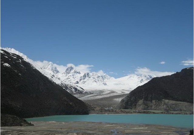 湖畔西南有崗日嘎布雪山,南有阿扎貢拉冰川,東北方向有伯舒拉嶺。四周雪山的冰雪融水構(gòu)成了然烏湖主要的補(bǔ)給水源,井使湖水向西傾瀉形成西藏著名河流雅魯藏布江重要支流帕隆藏布的上源之一。其形成是由于山體滑坡或泥石流堵塞河道而形成的堰塞湖,處于喜馬拉雅山、念青唐古拉山和橫斷山的對(duì)撞處。