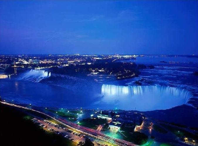 尼亞加拉瀑布在白天看波瀾壯闊,入夜后則是另一番景象。在紅日西墜時(shí),珠幔般的水花,在夕陽(yáng)映照下,七彩虹霓,燦然入目。當(dāng)夜幕降臨之際,瀑布水色漸顯灰黯,此時(shí)圍繞著瀑布周?chē)木扌途酃鉄?,突然齊放綠光,使原已灰黯的瀑布,頓時(shí)大放光彩,變得晶瑩透澈,熠熠生輝。尤其從塔頂望出去,到處是五顏六色的燈光,瀑布的景象比白天更加多姿多彩。在夏季的每個(gè)星期五,尼亞加拉瀑布上空還有焰火表演。
