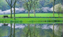 太子灣公園引東鄰凈慈寺、天園及張蒼水墓祠、章太炎墓道,西接南高峰,北有一長列高大蔥郁的水杉密林,如翠帷中垂,與車水馬龍的南屏路相隔,頗似一把太師椅的椅座。
