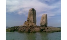 半洋石帆又稱石牌洋,在福建平潭島西北看澳村西側(cè)500多米的海面,遠(yuǎn)遠(yuǎn)望去有一個圓盤狀的大礁石,托著一高一低的兩塊碑形海蝕柱。整個礁石象一艘大船兩塊巨石象兩面鼓起的雙帆,似乎正在乘風(fēng)破浪前進(jìn)。這是平潭最著名的自然景觀——石牌洋。又稱為“半洋石帆”和“雙帆石”。