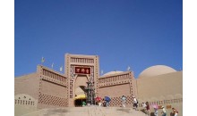 煙云燎繞的火焰山下,郁郁蔥蔥的木頭溝畔,一座規(guī)模宏大的人文 景觀,以其獨(dú)特的藝術(shù)風(fēng)格,屹立在312國(guó)道西側(cè),它就是1991年5月對(duì) 外開(kāi)放接待游人的新疆大漠土藝館, 地理坐標(biāo)89°32′7″E,42°56′ 8″N,海拔140米,由312國(guó)道的勝金口往北拐上前往柏孜克里克干佛洞的旅游專(zhuān)線公 路四公里處,便可看到大型停車(chē)場(chǎng)后的高坡上矗立著一座高大的民族風(fēng)格建筑群,正中是十四米高的磚砌圖案大門(mén).