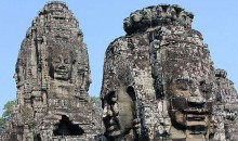 巴戎廟 位于柬埔寨暹粒,吳哥城內(nèi)最為出名的要數(shù)巴戎廟中的佛塔了,巴戎廟位于吳哥城的中心位置,巴戎廟是由一組共49座小寶塔圍繞中央尖塔構(gòu)成的建筑群,這些塔在佛語(yǔ)里又被稱(chēng)做浮屠,每一座塔的四面都雕刻著巨大的佛面,也正因?yàn)槿绱?,這些塔又被稱(chēng)作佛面塔,上面的佛被稱(chēng)為四面佛。
